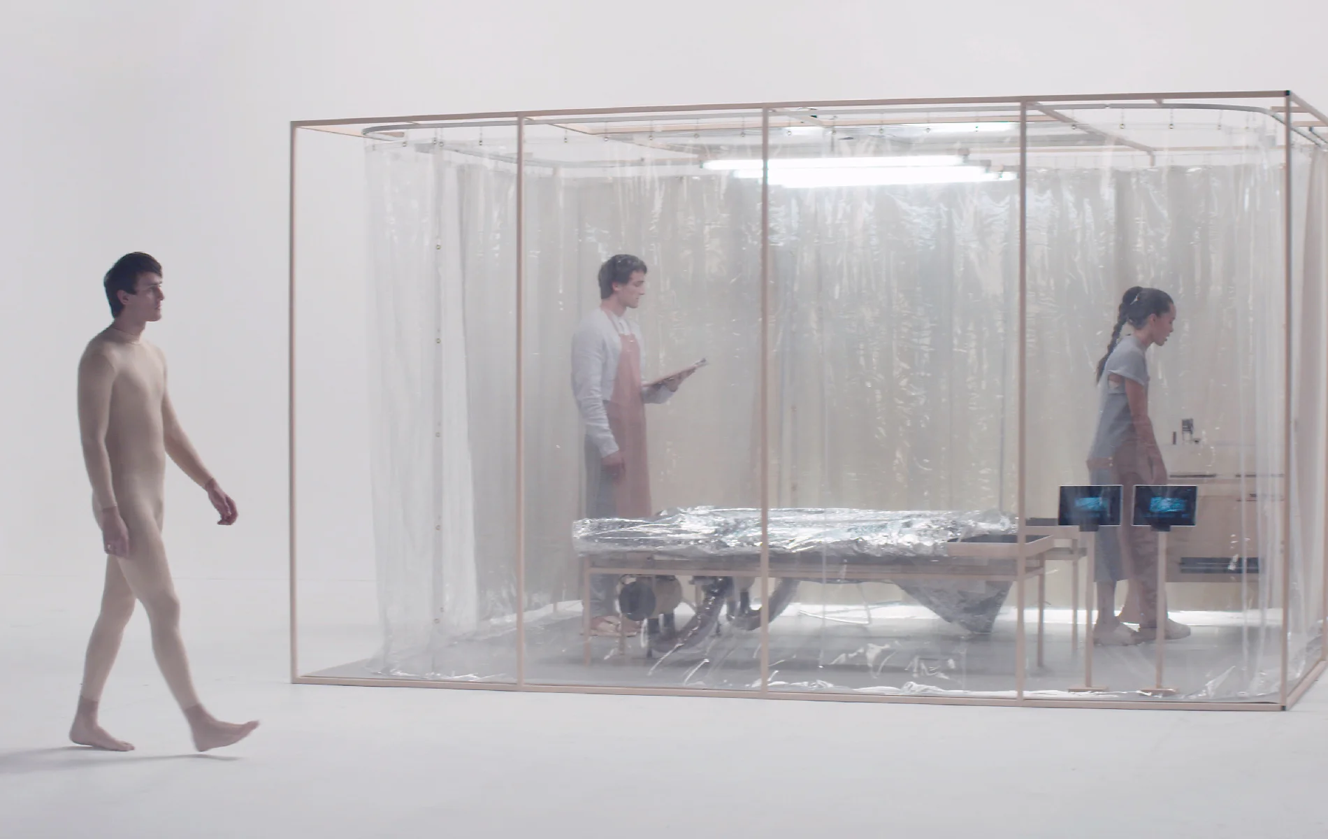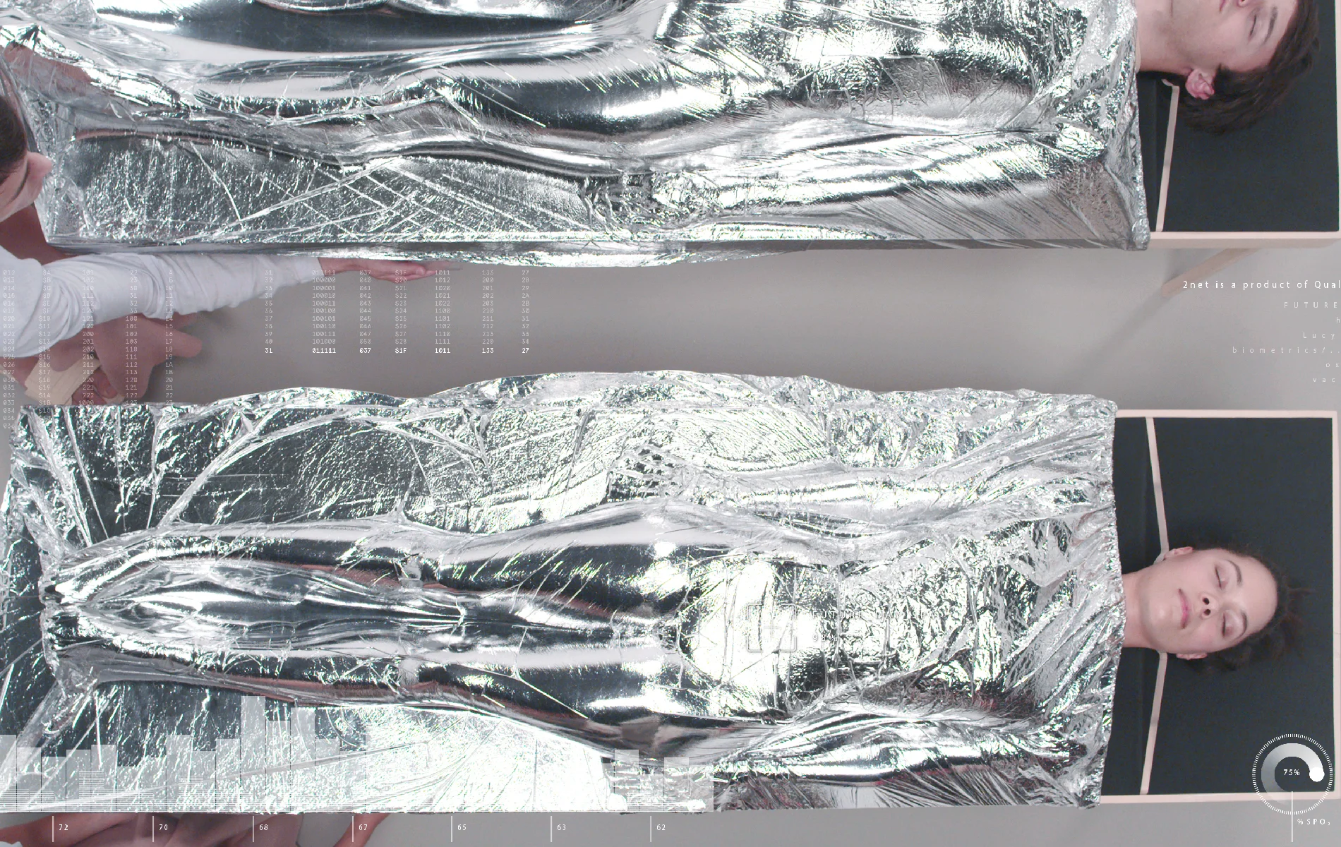 Guided by a therapist, participants enter a clean room and lay down underneath a pressurised sheet, as a controlled vacuum is applied to the entire body. Biometric technologies are integrated into each treatment capturing physiological changes to the body. Clients review their depth of their relaxation and how they compared to previous visitors.